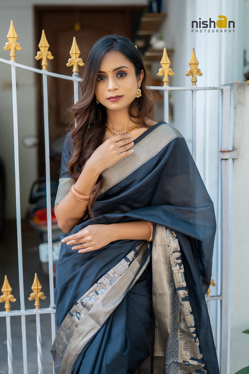 Black Soft Viscose Khadi Silk Partywear Saree with Satin Border & Jacquard Design
