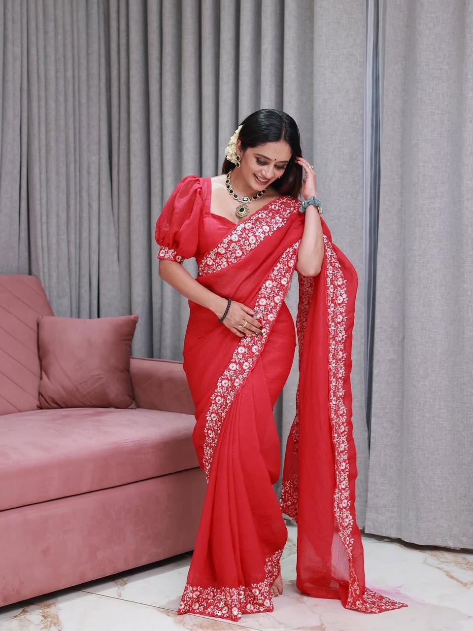 Bright Red Viscose Georgette Saree with Running Blouse – Elegant Partywear Collection
