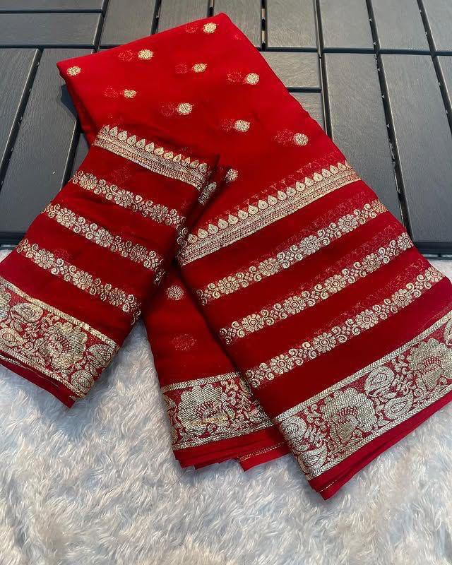 Bright Red Viscose Georgette Saree with Running Blouse – Elegant Partywear Collection