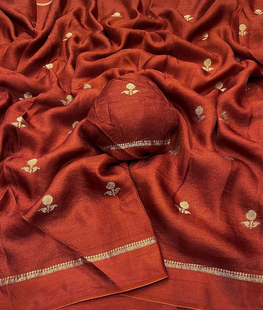 Elevate your festive and wedding wardrobe with this luxurious soft viscose Khadi silk saree, featuring a satin border and intricate jacquard leaf motifs all over. Comes with a matching running blouse, perfect for partywear, weddings, and festive celebrations.