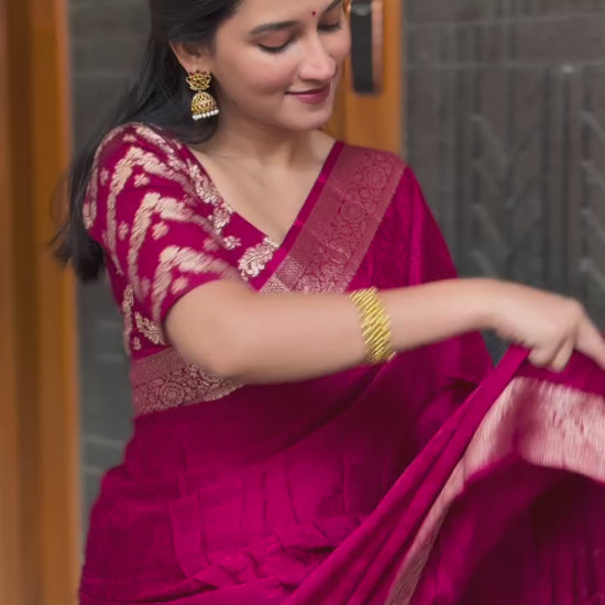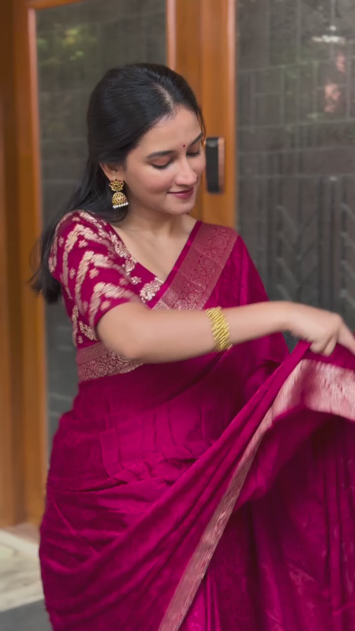 Grace your celebrations with this new arrival viscose chinon saree, beautifully detailed with weaving patterns and paired with a luxurious Dola Banarasi silk blouse. A perfect pick for weddings, festive occasions, and elegant partywear.